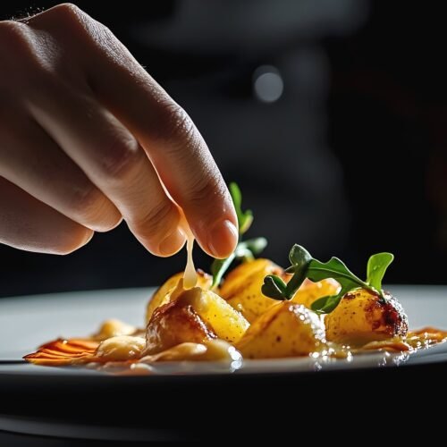 Empanadilla al vapor rellena de vegetales y crema suave de ajonegro