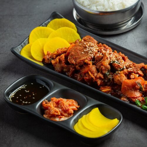 Pollo, Solomillo ternera flambeado y salsa especial NutriPisco.